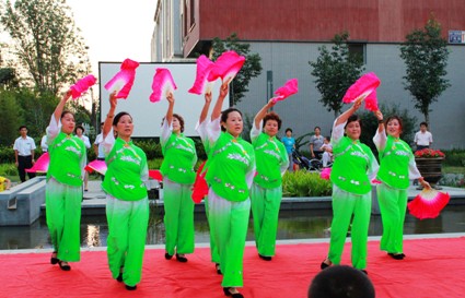 8月19日下午,北纬40度物业管理处的员工们冒着火辣辣的太阳布置好了晚会现场,美味的小吃也排排放好,准备迎接业主前来。业主们在太阳威力刚刚削弱的时候来了晚会现场,一家家围着圆桌就坐。孩子们被桌台上长长的消夏“美食阵”吸引,围到台前点自己喜爱的小吃,烤羊肉串的烤箱前也排起了队伍,阵阵香气在空气中飘散。北纬40度的文艺组织带来了精心准备的歌舞表演,业主们吃的开心,聊的过瘾,看的尽兴,现场气氛十分热闹。