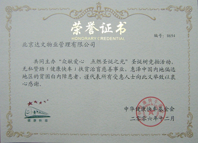 达文物业获中华健康快车基金会颁发的荣誉证书